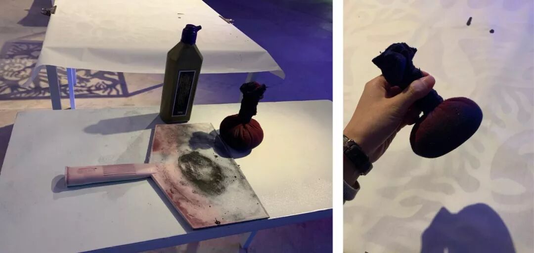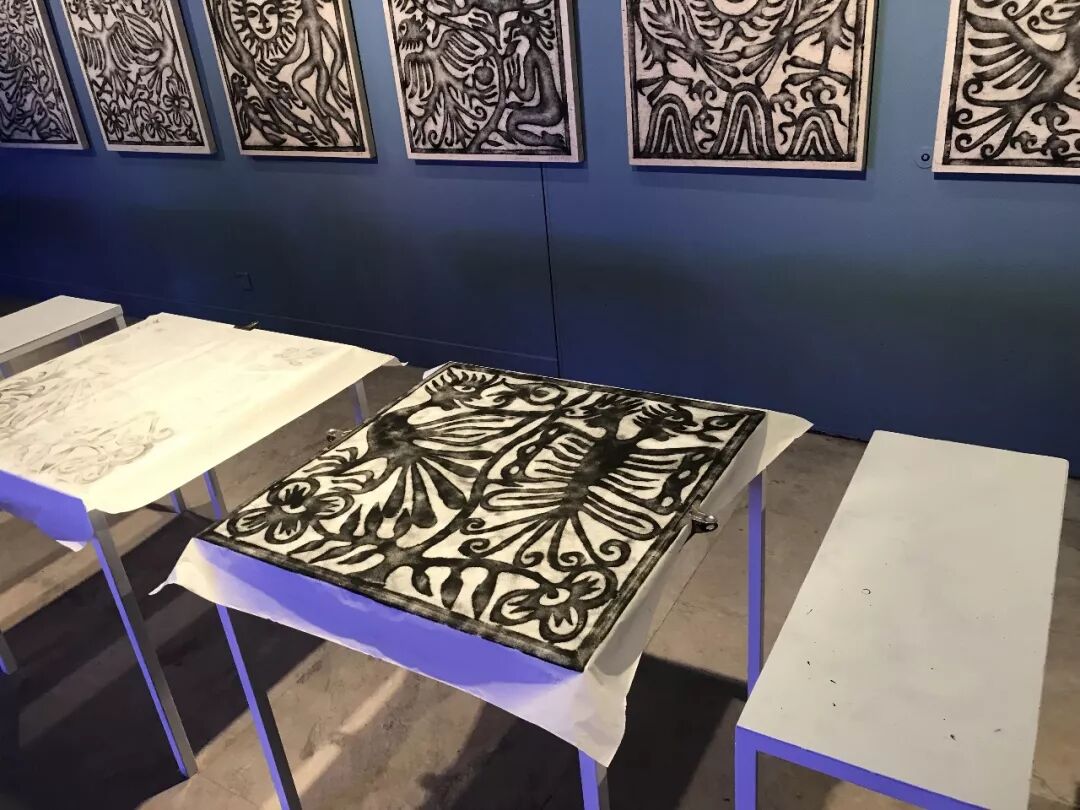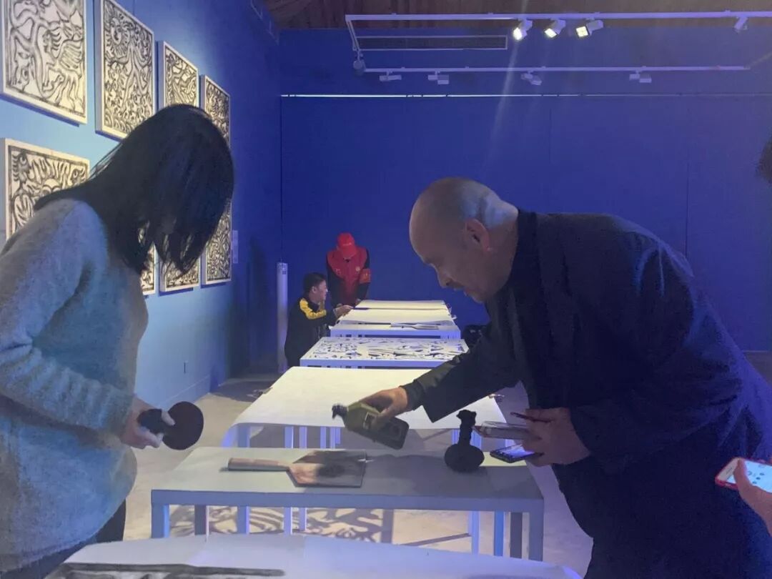 本次参展艺术家任戎的作品《创世纪》属于铁板镂空拓印,与其他艺术家不同的是,他的作品需要观众参与其中,亲身体验拓印的过程。这既是艺术家作品的延伸,也是当代艺术强调互动、参与的一种表现。本周起我们将邀请观众朋友们来现场体验拓印的创作过程。